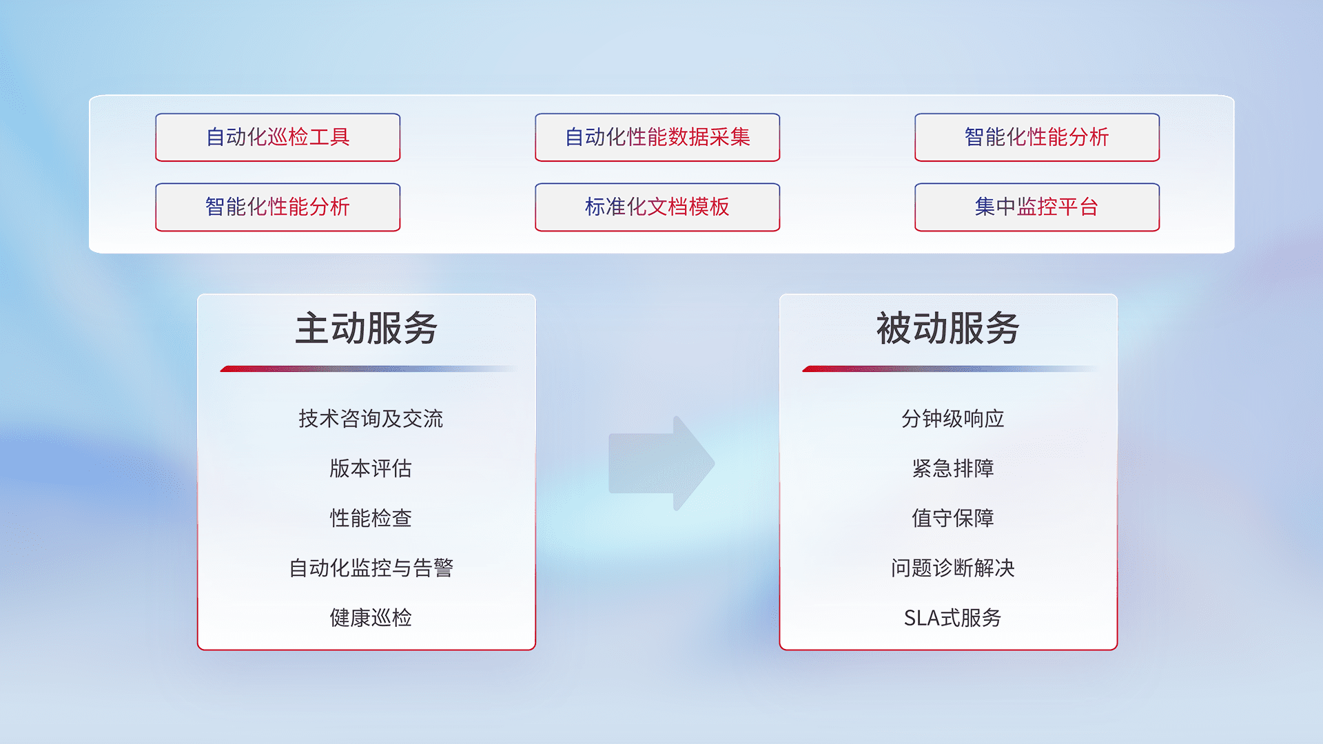 智能化工具和标准化文档,,,保障服务质量,,,提供主动服务(包含技术咨询、、版本评估、、、、性能检查、、、、自动化监控与告警、、健康巡检)和被动服务包含(分钟级响应、、紧急排障、、、值守保障、、、、问题诊断解决、、、、SLA服务)。。。